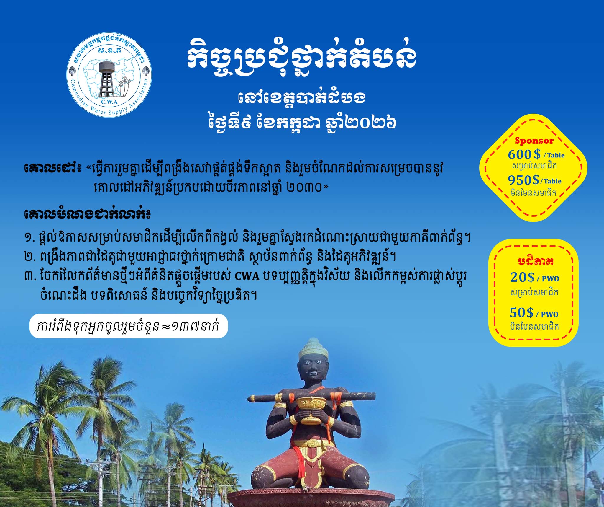 ដូច្នេះសមាគមអ្នកផ្គត់ផ្គង់ទឹកស្អាតកម្ពុជា អង្គការដៃគូរ សមាជិកអ្នកគាំទ្រ មានកិច្ចសហការក្នុងការរៀបចំកិច្ចប្រជុំថ្នាក់តំបន់លើកទី២ នៅថ្ងៃទី៩ ខែកក្កដា ឆ្នាំ២០២៦ នៅខេត្តបាត់ដំបង រំពឹងទុកអ្នកចូលរួមប្រហែល ១៣៧នាក់។