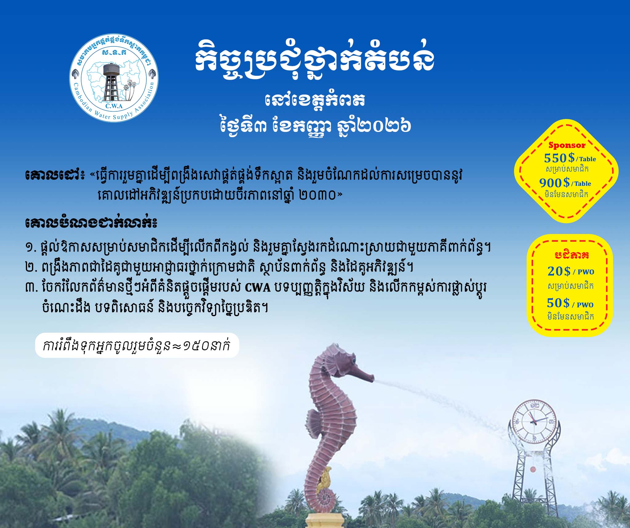 Therefore, the Cambodian Water Supply Association, development partners and its supporting members collaborate to organize the third regional meeting on September 3, 2026 in Kampot province with an expected attendance of 150 participants.